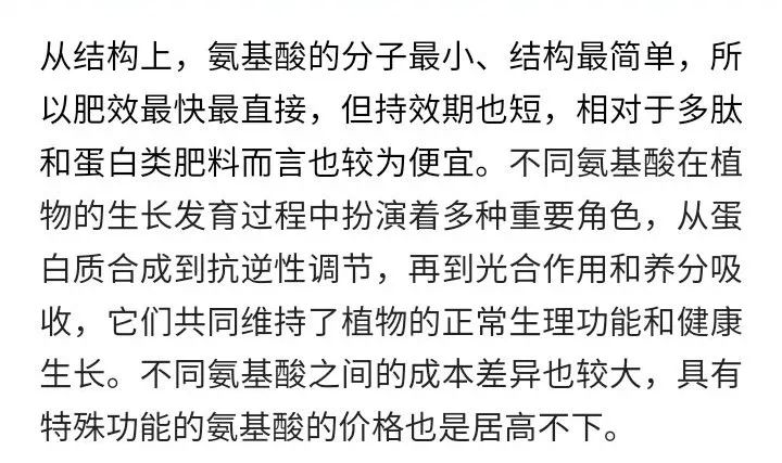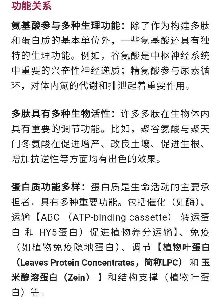 氨基酸、多肽、蛋白質(zhì)、酶之間的關(guān)系及在植物中的作用發(fā)表時(shí)間:2025-05-28 11:25 ![]() ![]() ![]() ![]() ![]() ![]() ![]() 氨基酸、多肽、蛋白質(zhì)和酶在植物中的作用 1. 氨基酸: 氨基酸可以作為植物的營養(yǎng)源,提高其生長和發(fā)育。植物吸收氨基酸后可以快速形成蛋白質(zhì)、核酸等生物分子,促進(jìn)植物細(xì)胞分裂和組織生長。此外,氨基酸在植物干旱、鹽漬、低溫等逆境下可以提高植物的抗逆性,促進(jìn)植物生長。 2. 多肽: 多肽是植物生長調(diào)節(jié)劑的重要組成部分。多肽可以通過與膜受體結(jié)合,影響細(xì)胞內(nèi)信號(hào)轉(zhuǎn)導(dǎo)和生長發(fā)育過程。例如,多肽類生長素和多肽類激素在植物生長和發(fā)育中起著重要的作用,可以促進(jìn)植物生長和根生。多肽還可以在植物免疫防御中擔(dān)任重要角色,如能夠誘導(dǎo)植物產(chǎn)生抗氧化物質(zhì),增強(qiáng)植物對病蟲害的抵抗力。 3. 蛋白質(zhì): 蛋白質(zhì)在農(nóng)業(yè)種植領(lǐng)域有多種應(yīng)用。在植物種植過程中,蛋白質(zhì)可以作為肥料成分,供植物吸收并促進(jìn)植物生長。此外,一些蛋白質(zhì)類激素和生長素在調(diào)節(jié)植物生長和發(fā)育上也發(fā)揮重要作用。在生物農(nóng)藥和抗性育種中,蛋白質(zhì)也被廣泛應(yīng)用。 4. 酶: 酶在農(nóng)業(yè)種植領(lǐng)域的作用也非常重要。例如,一些酶可以提高土壤的肥力和水分利用率,有益于植物生長和發(fā)育。還有一些酶可以用于植物保護(hù)和控制農(nóng)作物病蟲害,例如水解酶可以降低植物細(xì)胞壁的抗性,導(dǎo)致微生物和有害昆蟲無法存活。 1. 丙氨酸Alanine:增加葉綠素的合成,調(diào)節(jié)葉片氣孔,抵抗病菌入侵。 2. 精氨酸Arginine:促進(jìn)根系生長; 提高植物的耐鹽能力。 3. 天門冬氨酸Aspartate:促進(jìn)種子發(fā)芽和蛋白質(zhì)的合成,并在快速生長期提供充足的氮元素。 4. 半胱氨酸Cysteine:具有抗氧化的作用,維持細(xì)胞功能。 5. 谷氨酸Glutamate:降低作物中的硝酸鹽含量。促進(jìn)種子發(fā)芽,促進(jìn)葉片光合作用,增加葉綠素的合成。 6. 甘氨酸Glycine:增強(qiáng)作物的光合作用,有利于作物生長,增加作物含糖量。而且它是天然的金屬螯合劑。 7. 組氨酸Histidine:調(diào)節(jié)葉片氣孔,抵抗病菌入侵。促進(jìn)細(xì)胞分裂素的合成。 8. 異亮氨酸、亮氨酸Isoleucine and leucine:提高耐鹽能力,提升花粉的活力和芳香性,促進(jìn)萌芽。 ![]() 9. 賴氨酸Lysine:促進(jìn)葉綠素的合成,增強(qiáng)植物抗寒抗旱的能力。 10. 蛋氨酸Methionine:促進(jìn)植物內(nèi)源激素乙烯和多胺的合成。 11. 苯丙氨酸Phenylalanine:促進(jìn)木質(zhì)素和花青素的合成。 12. 脯氨酸Proline:提高植物對滲透脅迫的抗性和花粉的活力。 13. 絲氨酸Serine:參與細(xì)胞分化,促進(jìn)發(fā)芽。 14. 蘇氨酸Threonine:提高植物的耐受性,減少蟲害,改善腐殖質(zhì)化過程。 15. 色氨酸Tryptophan:促進(jìn)內(nèi)源激素生長素吲哚乙酸的合成,改善芳香族化合物的合成。 16. 酪氨酸Tyrosine:增強(qiáng)植物的抗旱性,提升花粉的活力和促進(jìn)萌芽。 17. 纈氨酸Valine:提高種子發(fā)芽率和改善作物風(fēng)味。 ![]() 多肽類肥料,含有多種氨基酸,且被吸收后可直接用來合成蛋白質(zhì),省去了氨基酸合成肽鏈的步驟,保證了肥料的效果。與此同時(shí),多肽的功能比氨基酸多,更容易刺激作物,產(chǎn)生對生長有利的物質(zhì)。 由于成本優(yōu)勢,近些年來以海洋低值魚類生產(chǎn)的魚蛋白肥料成為蛋白類肥料的主流。由低值魚經(jīng)過降解形成,主要成分是氨基酸、多肽和部分蛋白質(zhì)形成的混合物,此外還有一些微量元素和脂類、維生素等。其成分比較復(fù)雜,較氨基酸和多肽,功能更加多元,效果更加明顯。 但就實(shí)際市場而言,市場上90%以上的魚蛋白肥料實(shí)為糖蜜液或大豆蛋白液冒充,行業(yè)內(nèi)卷使假貨泛濫成災(zāi)。購買時(shí)需格外引起注意。 生物酶肥料的市場相對比較混亂,幾乎沒有一個(gè)明顯的界定標(biāo)準(zhǔn),大多以生物菌肥或復(fù)合肥形式在市場常見。 來源:肥料小知識(shí) 百度搜索網(wǎng)絡(luò) 整理 國內(nèi)魚蛋白生產(chǎn)需要有豐富的原材料作為基礎(chǔ),所以真正的魚蛋白生產(chǎn)基地都在海資源豐富的地區(qū),其中茂名有著豐富和優(yōu)質(zhì)的海資源。 ![]() 林氏魚肽有著豐富和優(yōu)質(zhì)的海魚資源,用高實(shí)力優(yōu)勢給予客戶信心。林氏魚肽-魚蛋白原料源頭工廠,真真正正以深海魚全魚為主要原料,采用深海魚全魚低溫定向酶解核心獨(dú)特技術(shù)研制,效果安全可靠!工廠建在廣東茂名,地處中國南海之濱,背山面海,有著豐富的海資源,海魚原料生產(chǎn)供應(yīng)地:廣東博賀漁港,被稱之為全國十大漁港之一。林氏魚肽源頭工廠距離博賀漁港直線距離僅2公里!