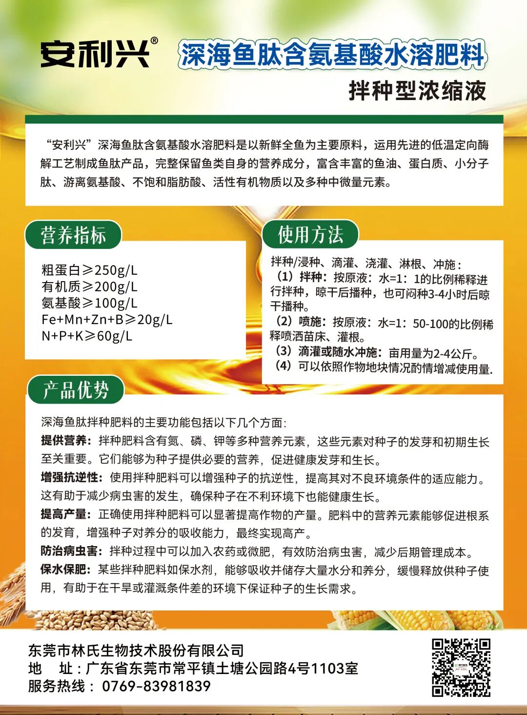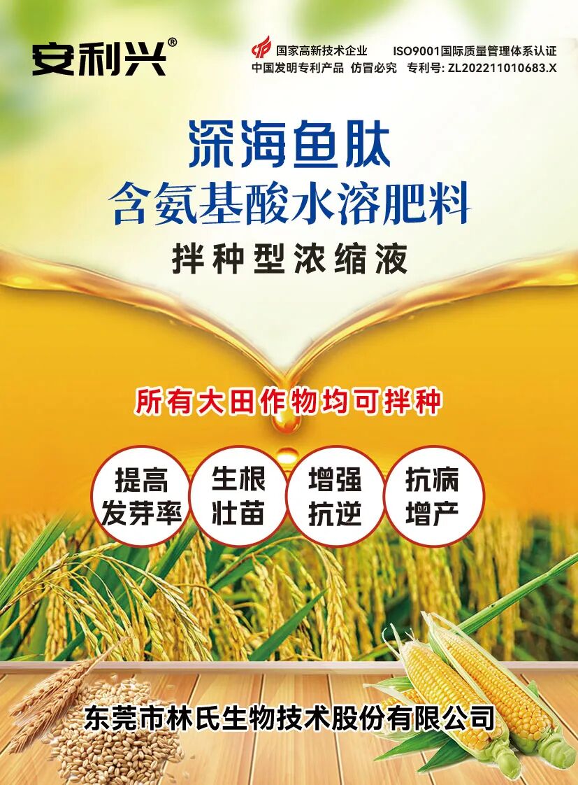 安利興—深海魚肽拌種肥發(fā)表時間:2026-01-06 15:29 ![]() 安利興 深海魚肽 含氨基酸水溶肥料 拌種型濃縮液 產(chǎn)品介紹 “安利興”深海魚肽含氨基酸水溶肥料是以新鮮全魚為主要原料,運用先進的低溫定向酶解工藝制成魚肽產(chǎn)品,完整保留魚類自身的營養(yǎng)成分,富含豐富的魚油、蛋白質(zhì)、小分子肽、游離氨基酸、不飽和脂肪酸、活性有機物質(zhì)以及多種中微量元素。 深海魚肽拌種肥 產(chǎn)品詳情 ![]() 品牌:安利興 產(chǎn)品品名:深海魚肽含氨基酸水溶肥料 規(guī)格:400g/瓶 30瓶/箱 產(chǎn)品形態(tài):水劑(本品為濃縮液) 主要成分: 粗蛋白≥250g/L 有機質(zhì)≥200g/L 游離氨基酸≥100g/L Fe+Mn+Zn+B≥20g/L N+P+K≥60g/L 水不溶物≤50g/L pH(1:250倍稀釋):4.5-6.5 ![]() 深海魚肽拌種肥 產(chǎn)品優(yōu)勢 深海魚肽拌種肥 ![]() 深海魚肽拌種肥 使用方法 ![]() 拌種/浸種、滴灌、澆灌、淋根、沖施 : ▲(1)拌種:按原液:水=1:1的比例稀釋進行拌種,晾干后播種,也可悶種3-4小時后晾干播種。 ▲(2)噴施:按原液:水=1:50-100的比例稀釋噴灑苗床、灌根。 ▲(3)滴灌或隨水沖施:畝用量為2-4公斤。 ▲(4)可以依照作物地塊情況酌情增減使用量。 ![]() 深海魚肽拌種肥 使用注意事項 1.嚴禁與強酸、強堿等對活性蛋白有破壞作用的物質(zhì)直接混用。 2.儲存于陰涼、干燥處,請勿讓兒童接觸,避免誤食。 3.儲存期間會產(chǎn)生少量沉淀屬于正常現(xiàn)象,使用前請充分搖勻,不影響使用效果。 4.本品可與大部分肥料混合使用,施用時先溶水均勻再與其他肥料混合。 ![]() ![]() |