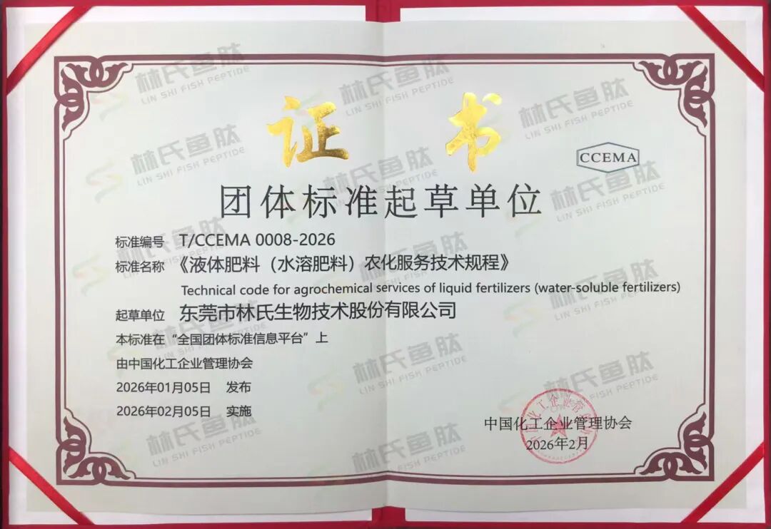 林氏魚肽憑借其專業(yè)的研發(fā)團(tuán)隊與先進(jìn)設(shè)備,在魚蛋白肽領(lǐng)域積累了深厚的技術(shù)底蘊(yùn)。曾參編《魚蛋白類肥料第1部分:生產(chǎn)技術(shù)規(guī)范》和《魚蛋白類肥料第2部分:產(chǎn)品要求》團(tuán)體標(biāo)準(zhǔn),能再次成為《液體肥料(水溶肥料)農(nóng)化服務(wù)技術(shù)規(guī)程》團(tuán)體標(biāo)準(zhǔn)起草單位,對林氏魚肽是里程碑,更是引領(lǐng)行業(yè)規(guī)范升級的新使命。