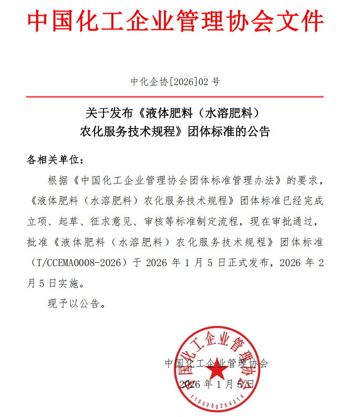 根據(jù)《中國化工企業(yè)管理協(xié)會團(tuán)體標(biāo)準(zhǔn)管理辦法》的要求,液體肥料(水溶肥料)農(nóng)化服務(wù)技術(shù)規(guī)程》團(tuán)體標(biāo)準(zhǔn)(T/CCEMA 0008-2026)歷經(jīng)立項、起草、征求意見及專家組嚴(yán)苛審核,于2026年1月5日正式發(fā)布,并將于2026年2月5日實施。
