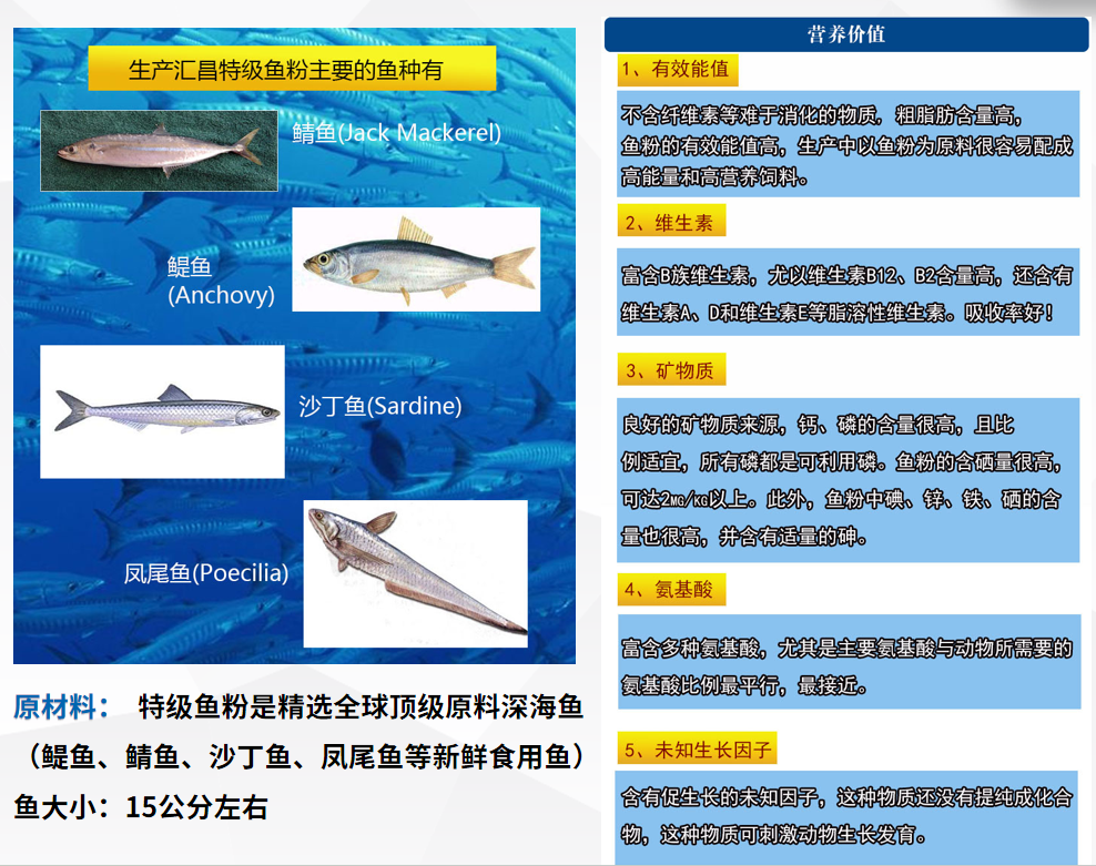 (8)有效能值:不含纖維素等難于消化的物質(zhì), 粗脂肪含量高,魚粉的有效能值高,生產(chǎn)中以魚粉為原料很容易配成高能量和高營養(yǎng)飼料。